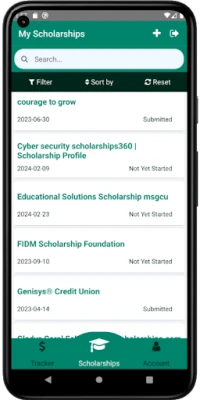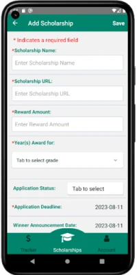 A place for students to keep track of scholarships they want to apply to and receive reminders not only for when it is almost due but also to come back and update whether or not they won it. Also, the app keeps track of how much they have received versus how much they need.